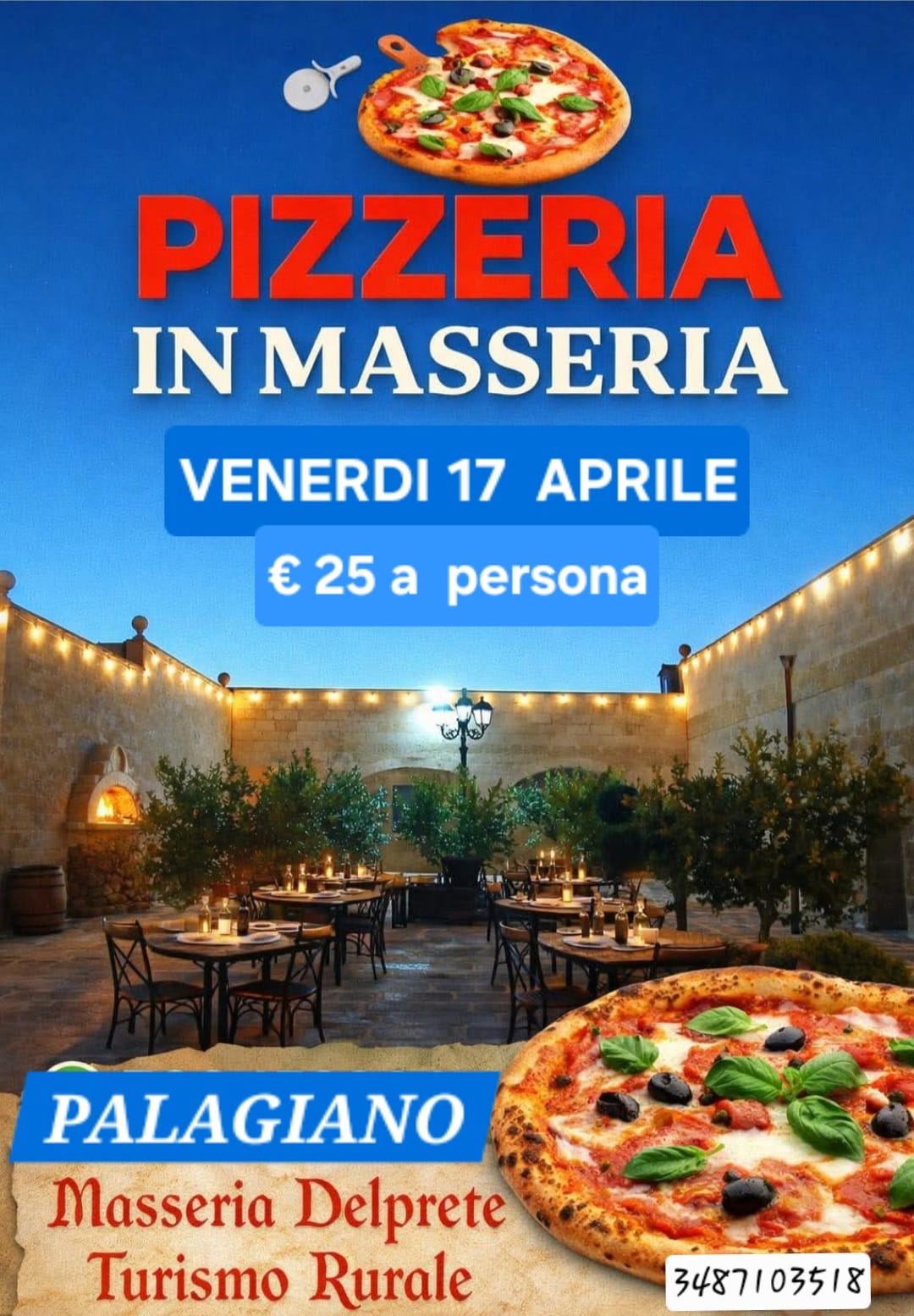 la Masseria Delprete di Palagiano è lieta di invitarci a una serata speciale dedicata alla convivialità e alla scoperta del territorio con l'evento "Pizzeria in Masseria".