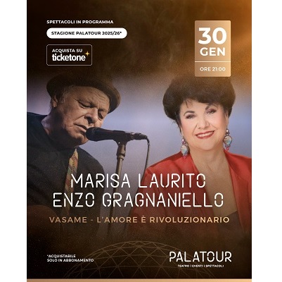 Il prossimo 30 gennaio, il teatro Palatour di Bitritto, ospiterà VASAME. L'AMORE E' RIVOLUZIONARIO con MARISA LAURITO ed ENZO GRAGNANIELLO QUARTET.