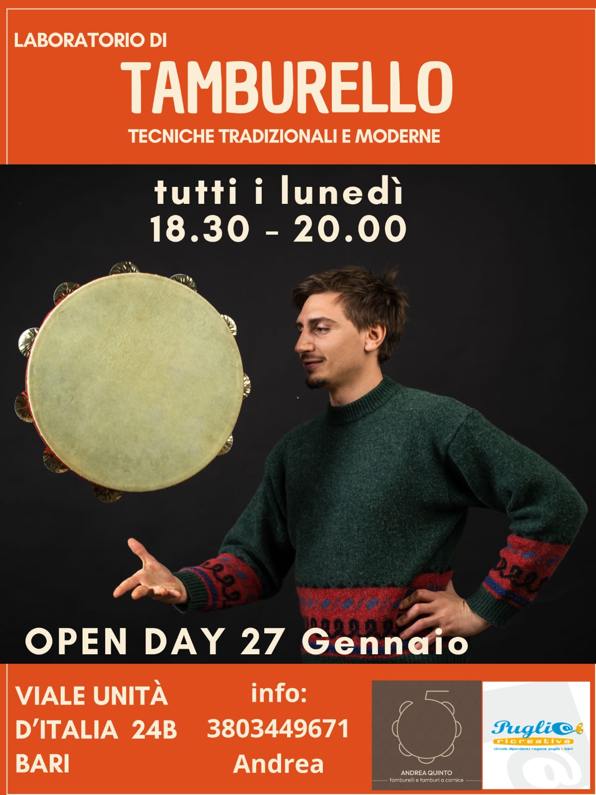Vieni a scoprire l'emozione di suonare il tamburello, cuore pulsante della pizzica, la danza che racconta storie di passione, tradizione e cultura del sud Italia. Con noi, apprenderai non solo le tecniche fondamentali per suonare questo strumento, ma anche a entrare nel ritmo travolgente di una delle danze popolari più affascinanti.