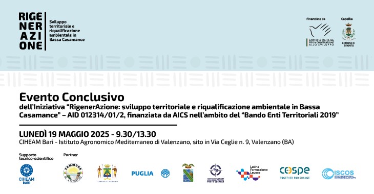 Lunedì 19 maggio 2025, dalle ore 9:30 alle 13:30, il CIHEAM Bari (Via Ceglie 9, Valenzano – BA) ospiterà l’Evento conclusivo dell’iniziativa “RigenerAzione: sviluppo territoriale e riqualificazione ambientale in Bassa Casamance” (AID 012314/01/2), progetto finanziato dall’Agenzia Italiana per la Cooperazione allo Sviluppo (AICS) nell’ambito del “Bando Enti Territoriali 2019” e guidato dal Comune di Bitonto.