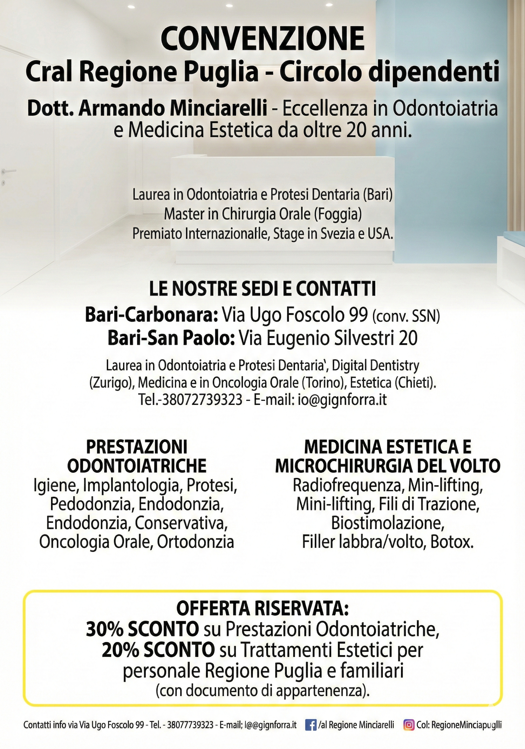 Vantaggiosa convenzione stipulata con gli Studi Dentistici Mec del dott. Armando Minciarelli, professionista con oltre vent'anni di esperienza clinica e pluripremiato a livello internazionale. Le due cliniche, situate a Bari in zona Carbonara e San Paolo, offrono ambienti accoglienti e tecnologie all'avanguardia. Grazie a questo accordo, i soci Cral Regione Puglia potranno beneficiare di uno sconto del 30% su tutte le prestazioni odontoiatriche e del 20% sui trattamenti estetici e micro-chirurgici del volto. I servizi a disposizione spaziano dall'igiene e implantologia, fino a moderni trattamenti estetici come filler e botox facciale. Per usufruire di queste agevolazioni, sarà sufficiente esibire un documento che attesti la propria appartenenza al Cral