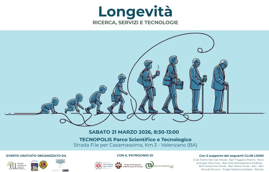 Si segnala agli iscritti e sostenitori il convegno "Longevità: ricerca, servizi, tecnologie" in programma sabato 21 marzo 2026, dalle ore 8:30 alle 13:00, presso Tecnopolis Parco Scientifico e Tecnologico a Valenzano (BA).