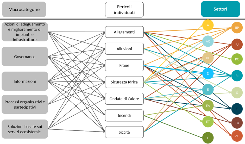 Lo studio prende a riferimento le azioni selezionate dal PNACC - Piano Nazionale di adattamento ai Cambiamenti Climatici che sono associate a 5 “Macrocategorie” che ne specificano la tipologia progettuale: informazione, processi organizzativi e partecipativi, governance, adeguamento e miglioramento di impianti e infrastrutture, soluzioni basate sui servizi ecosistemici, ecosistemi fluviali, costieri e marini, riqualificazione del costruito.