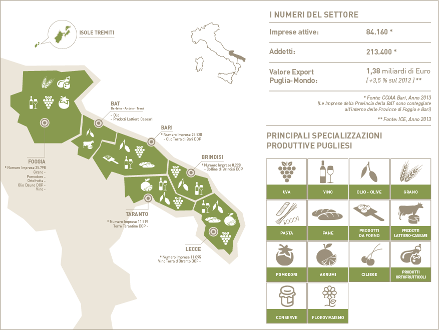 L’agroalimentare rappresenta da sempre uno dei punti di forza dell’economia pugliese. La principale risorsa della Puglia è nella ricchezza delle sue materie prime: ortaggi, frutta e cereali presenti nelle loro differenti varietà in tutta la regione grazie al clima mediterraneo, che garantisce temperature miti per gran parte dell’anno.