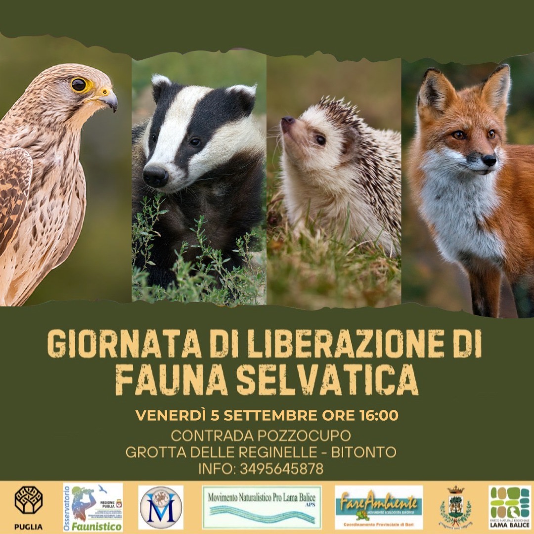 Venerdì 5 Settembre 2025 avverrà il rilascio in natura di esemplari appartenenti a diverse specie di fauna selvatica recuperati presso l'Osservatorio Faunistico Regionale in Bitetto (BA).
