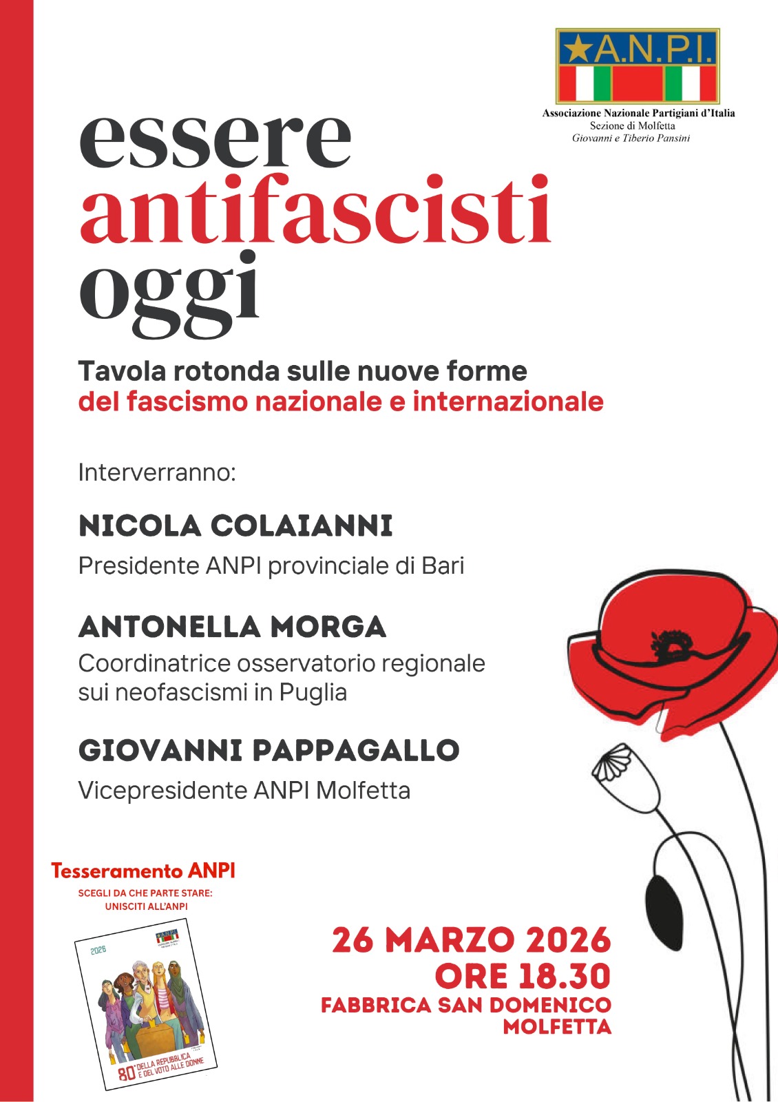La sezione ANPI di Molfetta ha organizzato l’incontro pubblico dal titolo “Essere antifascisti oggi”, che si svolgerà il 26 marzo 2026, alle ore 18.30, presso la Sala Finocchiaro della Fabbrica di San Domenico.
